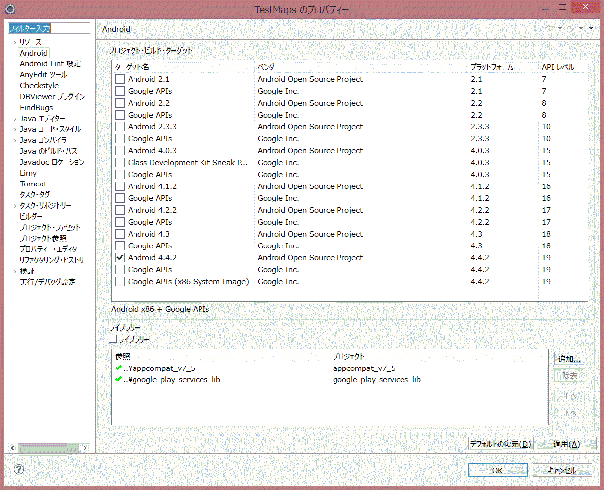 ライブラリの追加(プロジェクト→プロパティ→android→ライブラリ)